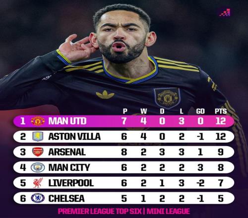 在刚刚结束的第23轮英超焦点战,曼联在酋长球场3-2击败阿森纳,OPTA盘点了本赛季至今积分榜前六名相互之间交锋的战绩。