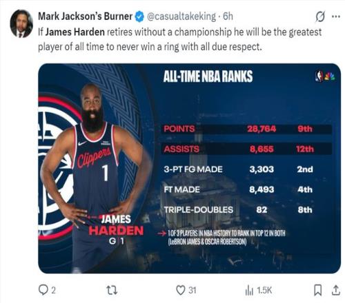 美媒写道:如果哈登生涯结束时依旧没有拿到总冠军,那么无论从哪方面考虑,他都是有史以来最伟大的无冕之王,在此我要表达崇高的敬意。